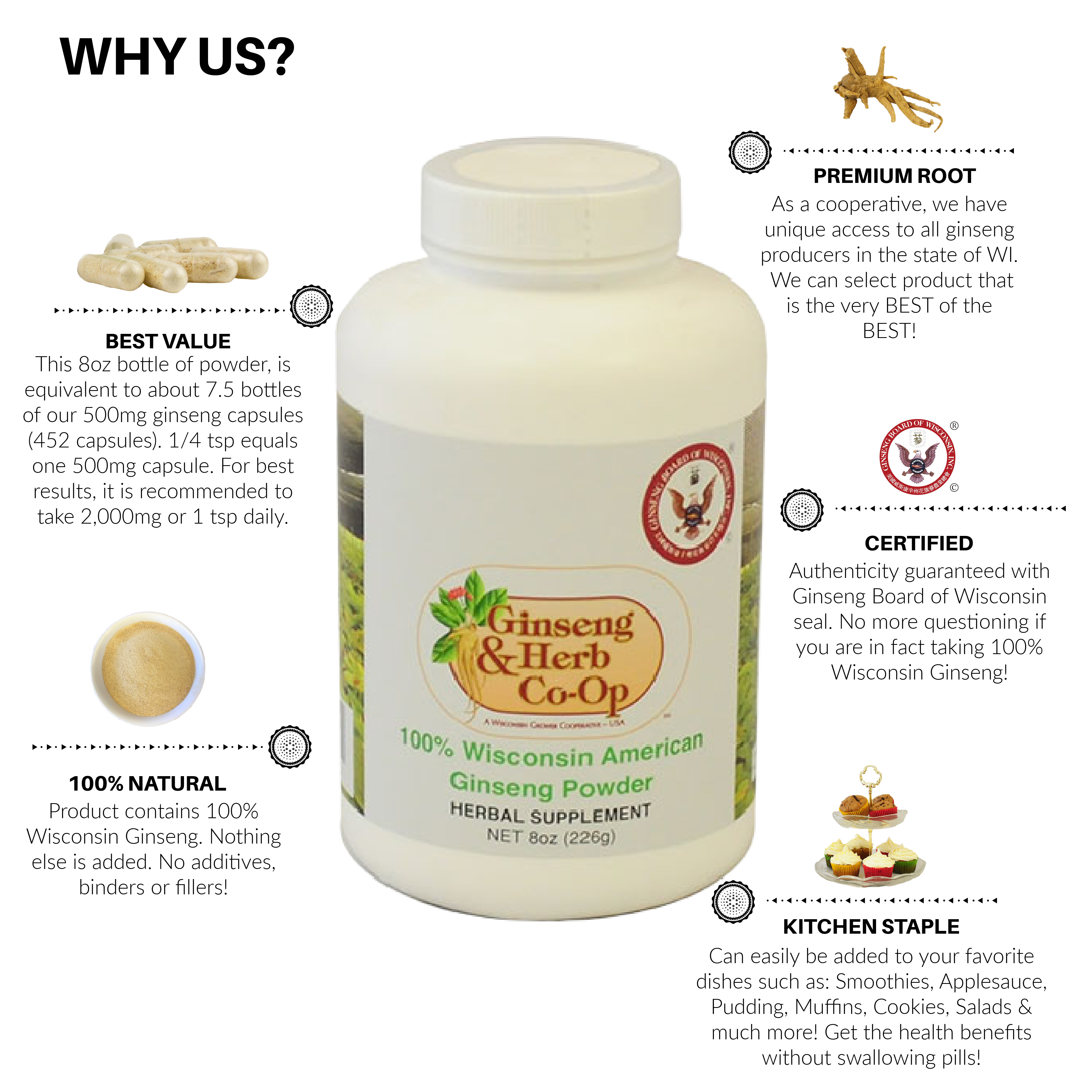 100% Pure Wisconsin Ginseng Powder. 100% Ground Wisconsin Ginseng Root. No additives, binders or fillers are added.